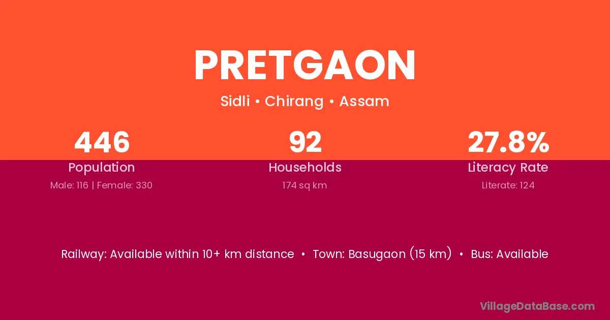 Pretgaon village has a total population of 446 people, of which 116 are males and 330 are females.