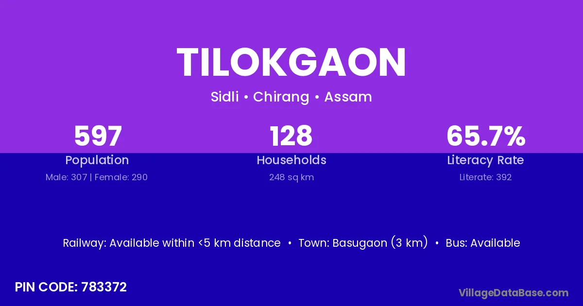 Basugaon (3 km) is the nearest town to Tilokgaon village for major economic activities and is located approximately 3 km away.