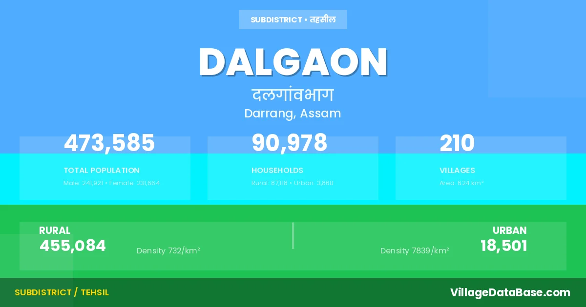 According to the 2011 census The total area of Dalgaon Subdivision is 624 km², with a population of 473585 people. The population density is 759 inhabitants per square kilometre, and there are approximately 90978 houses in the sub district.