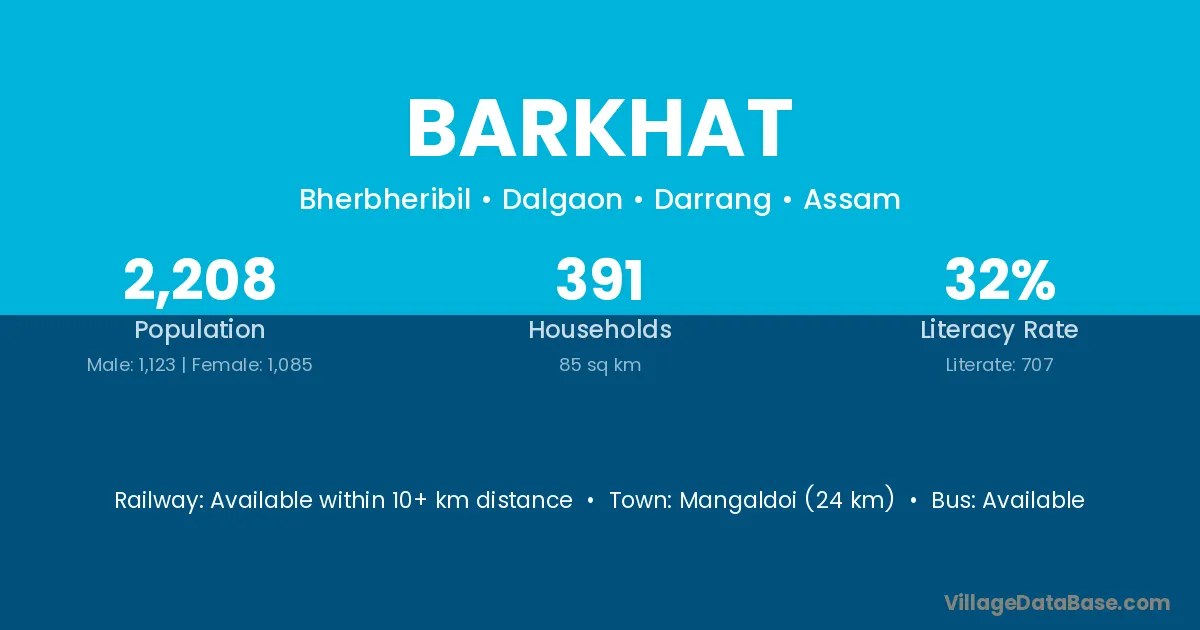 Mangaldoi (24 km) is the nearest town to Barkhat village for major economic activities and is located approximately 24 km away.