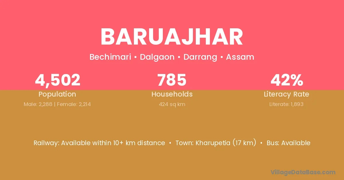 Kharupetia (17 km) is the nearest town to Baruajhar village for major economic activities and is located approximately 17 km away.