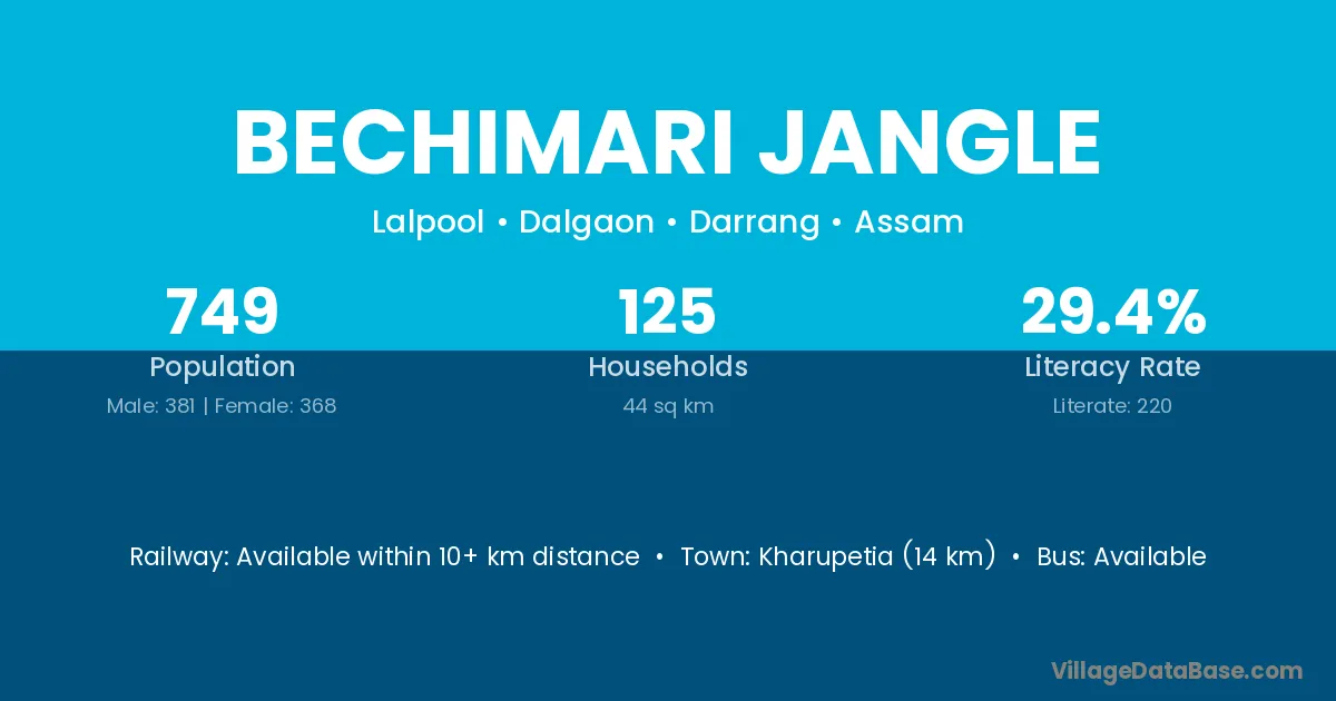 Kharupetia (14 km) is the nearest town to Bechimari Jangle village for major economic activities and is located approximately 14 km away.