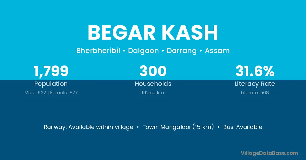 Mangaldoi (15 km) is the nearest town to Begar Kash village for major economic activities and is located approximately 15 km away.