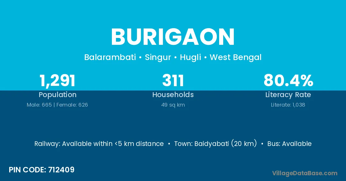 Burigaon village has a total population of 2,153 people, of which 1,102 are males and 1,051 are females.