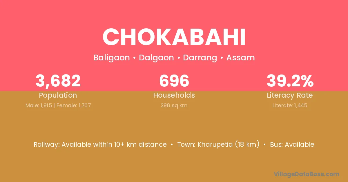 Kharupetia (18 km) is the nearest town to Chokabahi village for major economic activities and is located approximately 18 km away.