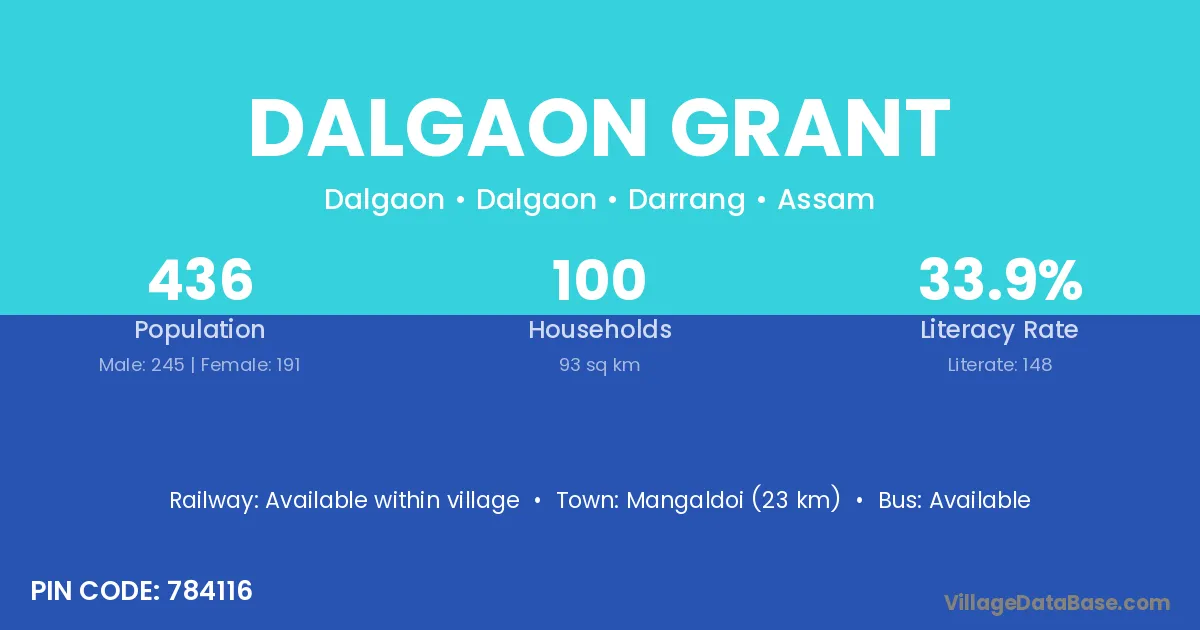 Dalgaon Grant village has a total population of 436 people, of which 245 are males and 191 are females.