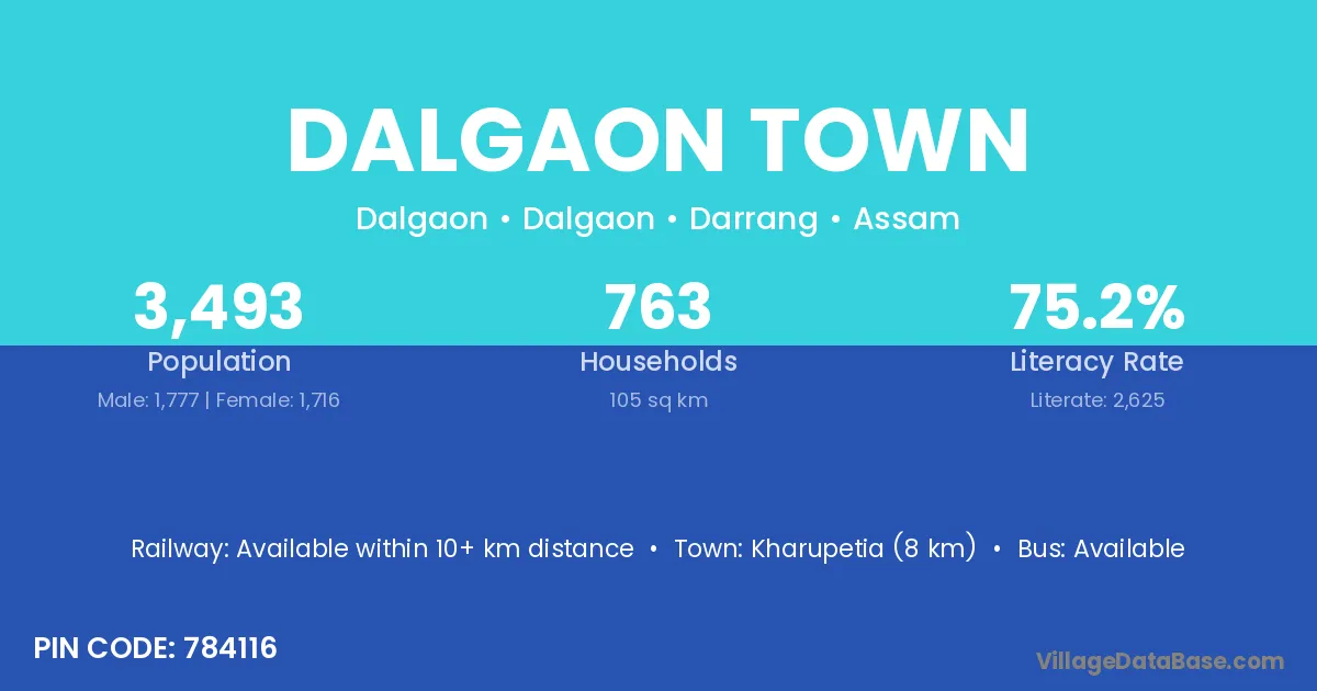 Kharupetia (8 km) is the nearest town to Dalgaon Town village for major economic activities and is located approximately 8 km away.