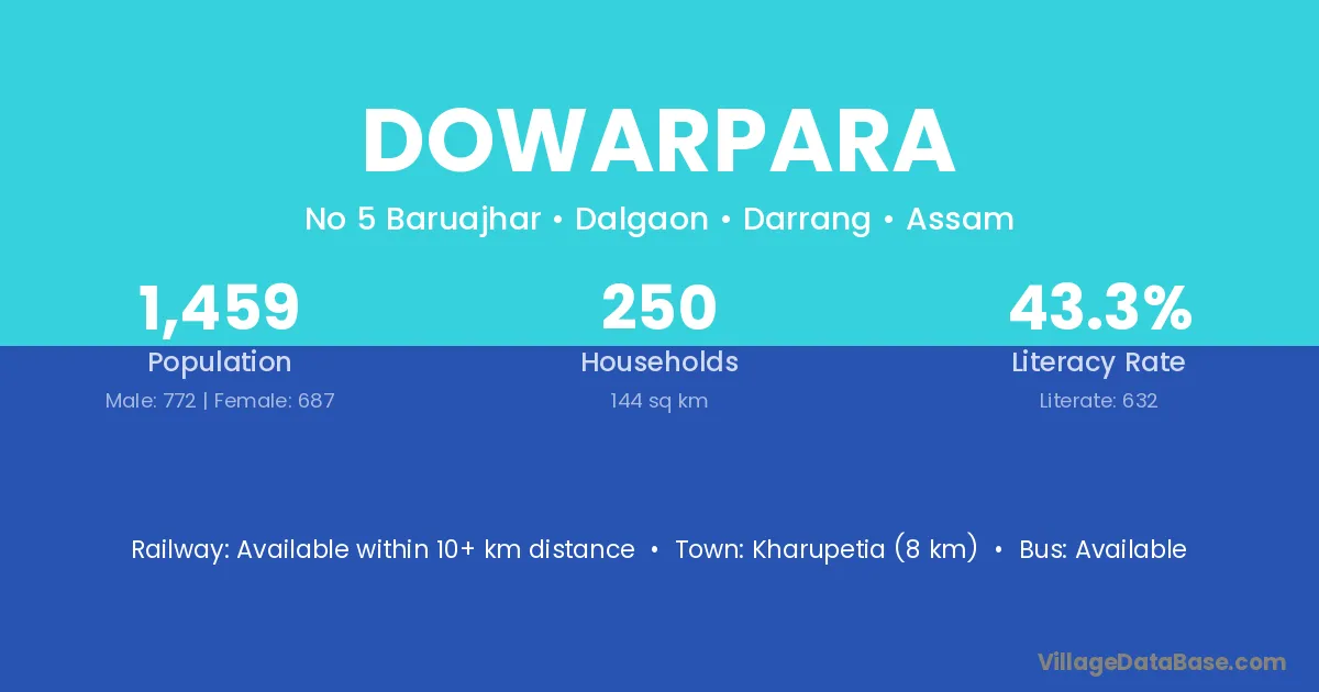 Kharupetia (8 km) is the nearest town to Dowarpara village for major economic activities and is located approximately 8 km away.