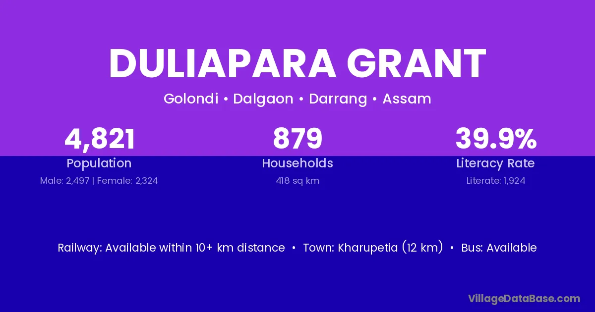 Kharupetia (12 km) is the nearest town to Duliapara Grant village for major economic activities and is located approximately 12 km away.