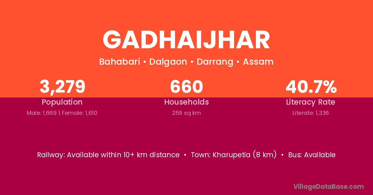 Kharupetia (8 km) is the nearest town to Gadhaijhar village for major economic activities and is located approximately 8 km away.