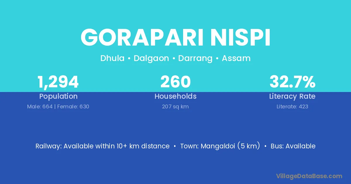 Mangaldoi (5 km) is the nearest town to Gorapari Nispi village for major economic activities and is located approximately 5 km away.