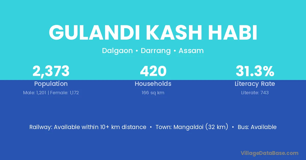 Mangaldoi (32 km) is the nearest town to Gulandi Kash Habi village for major economic activities and is located approximately 32 km away.
