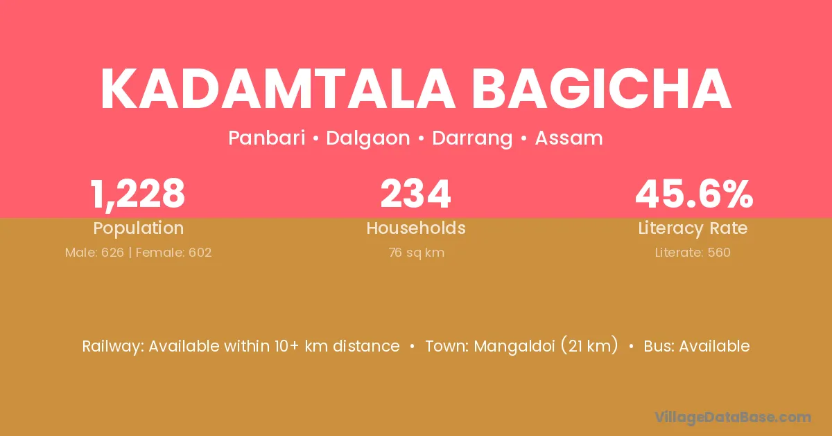 Mangaldoi (21 km) is the nearest town to Kadamtala Bagicha village for major economic activities and is located approximately 21 km away.