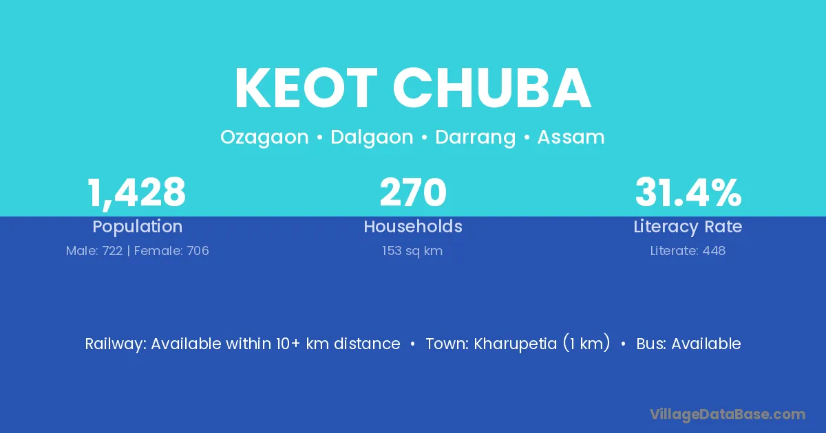 Kharupetia (1 km) is the nearest town to Keot Chuba village for major economic activities and is located approximately 1 km away.
