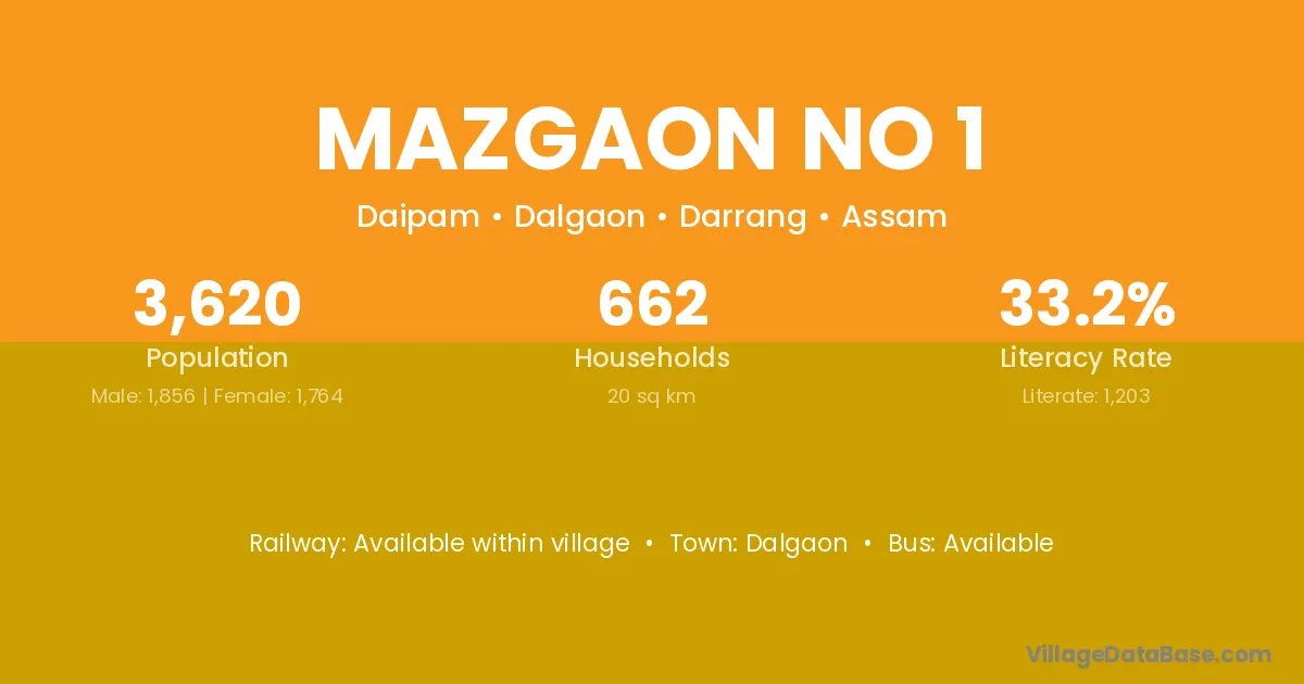 Mazgaon No 1 village has a total population of 3,620 people, of which 1,856 are males and 1,764 are females.