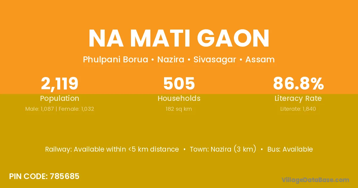 Kharupetia (14 km) is the nearest town to Na Mati Gaon village for major economic activities and is located approximately 14 km away.