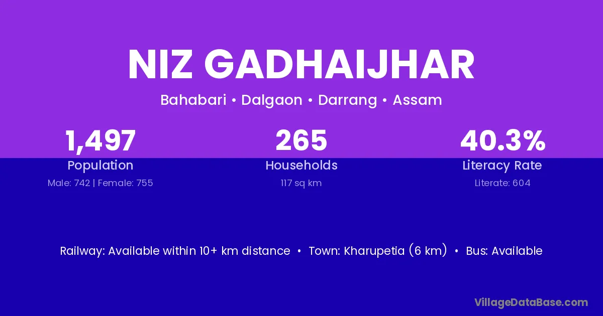 Kharupetia (6 km) is the nearest town to Niz Gadhaijhar village for major economic activities and is located approximately 6 km away.