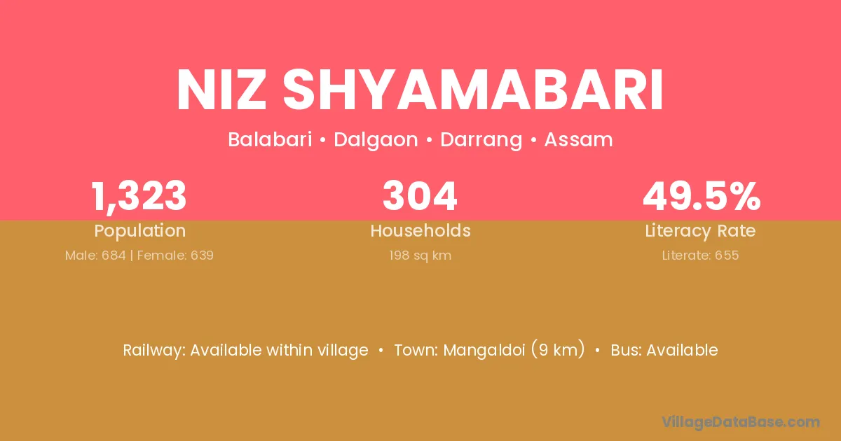 Mangaldoi (9 km) is the nearest town to Niz Shyamabari village for major economic activities and is located approximately 9 km away.