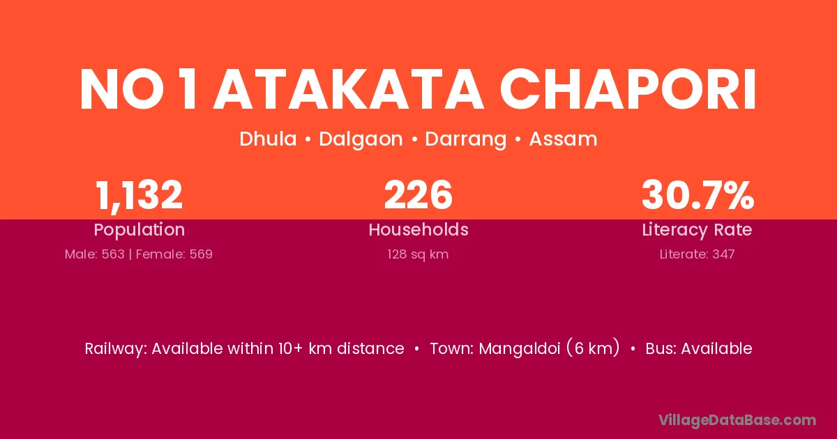 Mangaldoi (6 km) is the nearest town to No 1 Atakata Chapori village for major economic activities and is located approximately 6 km away.
