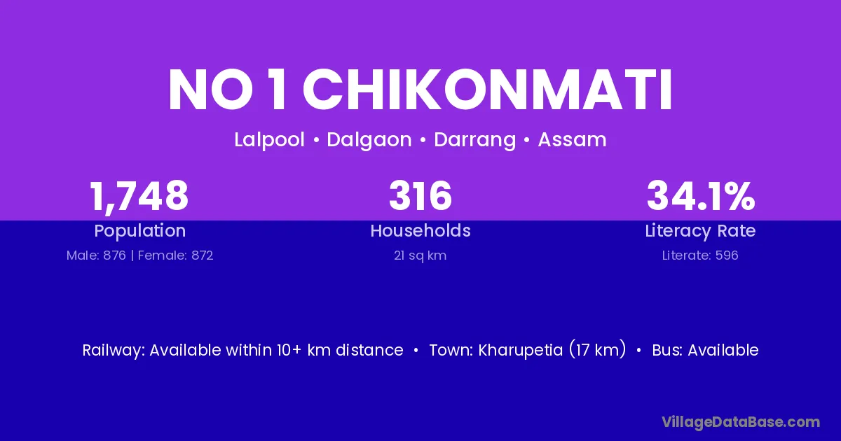 Kharupetia (17 km) is the nearest town to No 1 Chikonmati village for major economic activities and is located approximately 17 km away.
