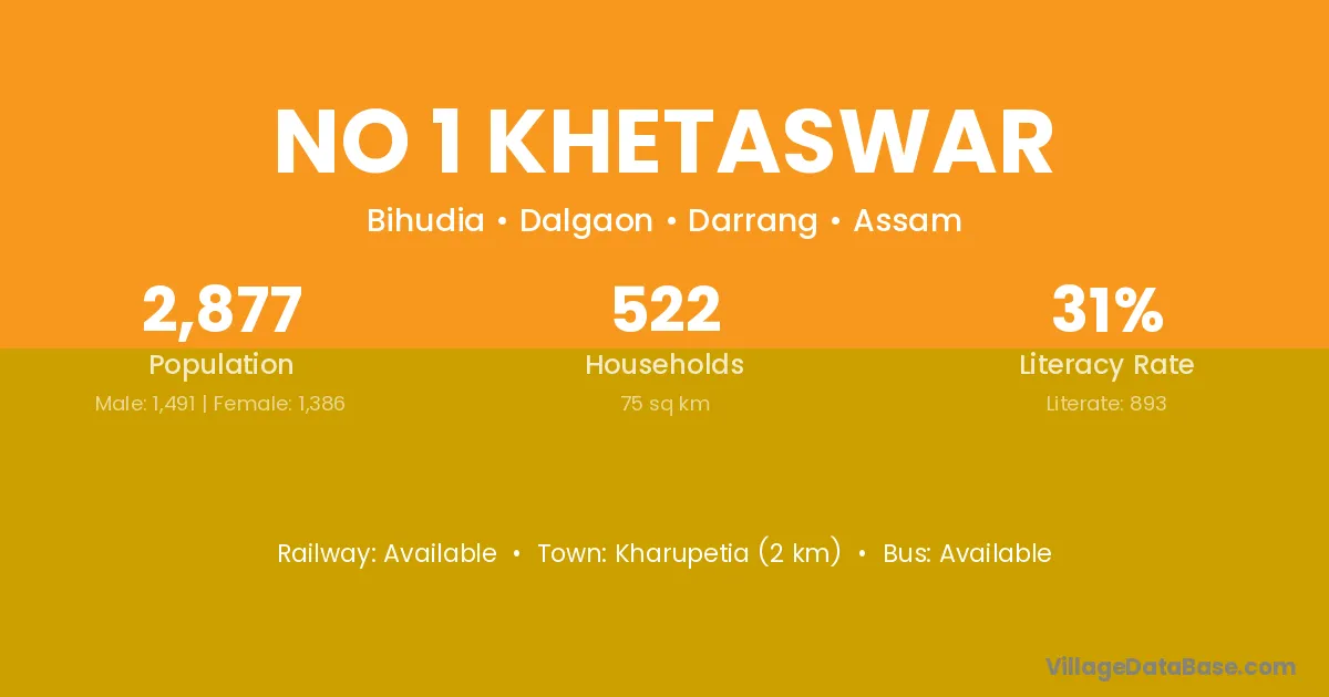 Kharupetia (2 km) is the nearest town to No 1 Khetaswar village for major economic activities and is located approximately 2 km away.