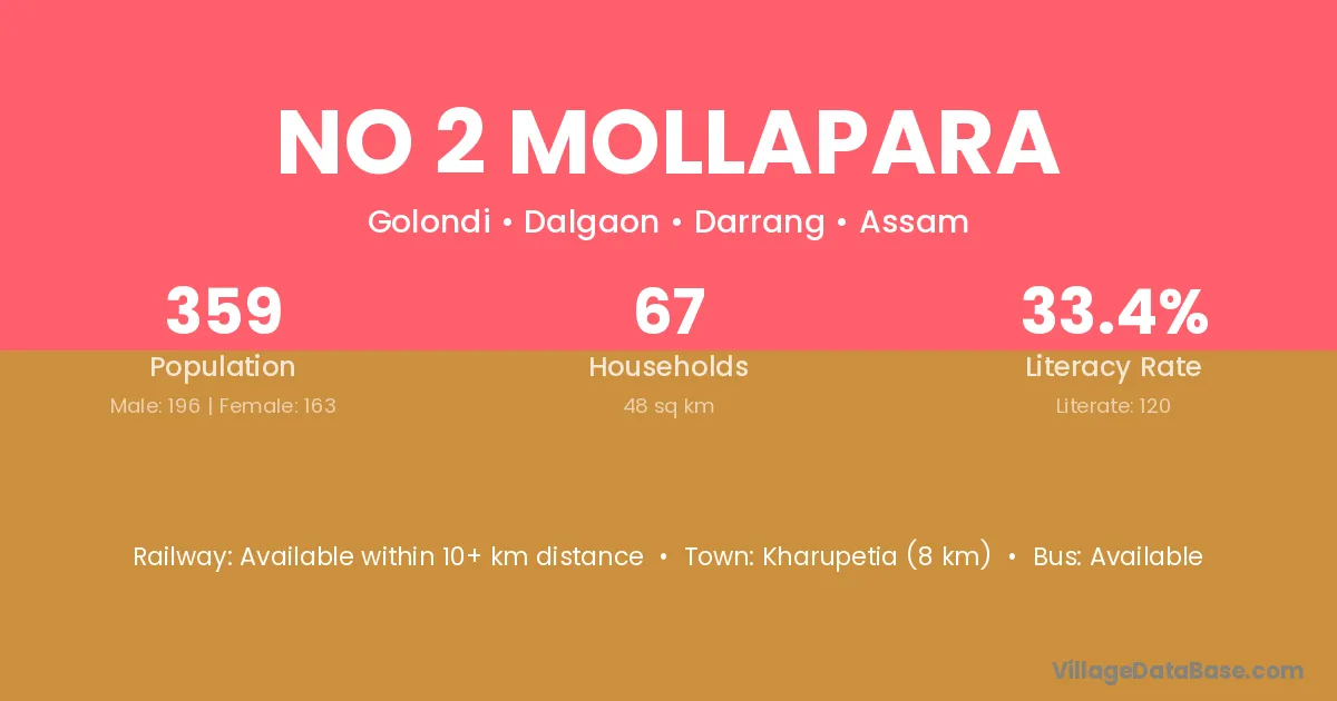 Kharupetia (8 km) is the nearest town to No 2 Mollapara village for major economic activities and is located approximately 8 km away.
