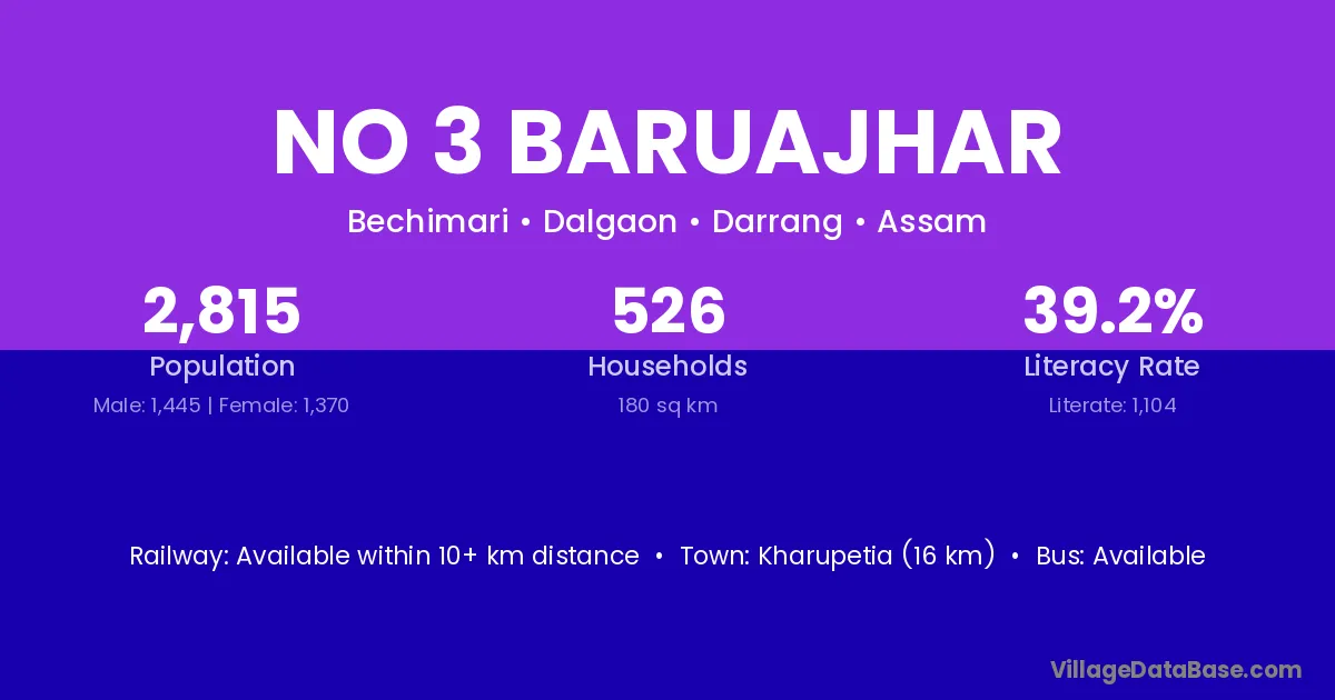 Kharupetia (16 km) is the nearest town to No 3 Baruajhar village for major economic activities and is located approximately 16 km away.