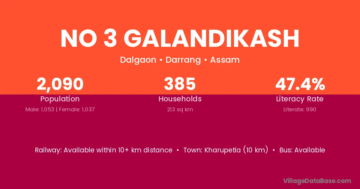 Kharupetia (10 km) is the nearest town to No 3 Galandikash village for major economic activities and is located approximately 10 km away.