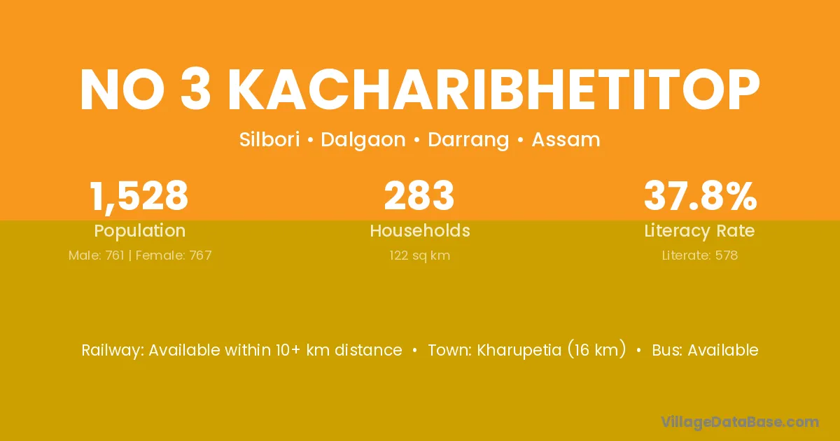 Kharupetia (16 km) is the nearest town to No 3 Kacharibhetitop village for major economic activities and is located approximately 16 km away.