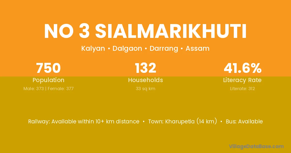 Kharupetia (14 km) is the nearest town to No 3 Sialmarikhuti village for major economic activities and is located approximately 14 km away.