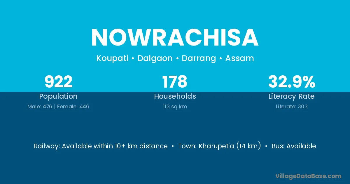Kharupetia (14 km) is the nearest town to Nowrachisa village for major economic activities and is located approximately 14 km away.