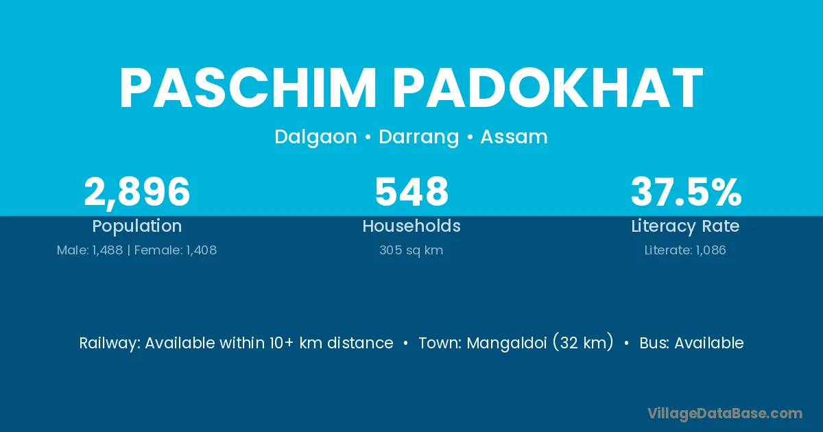 Mangaldoi (32 km) is the nearest town to Paschim Padokhat village for major economic activities and is located approximately 32 km away.