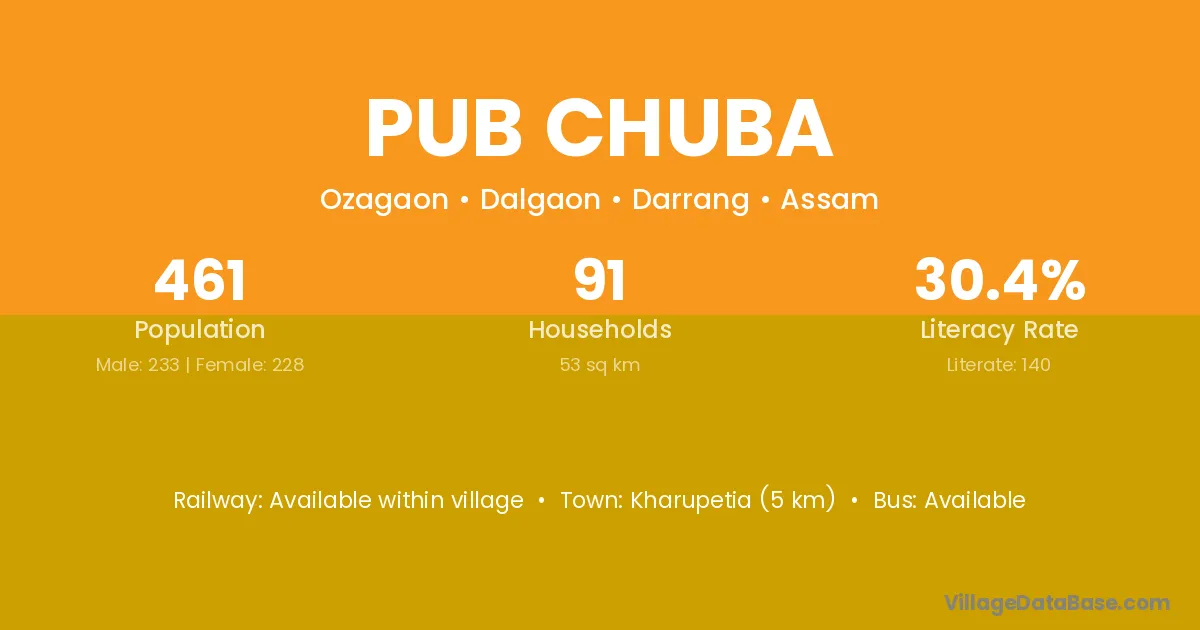 Kharupetia (5 km) is the nearest town to Pub Chuba village for major economic activities and is located approximately 5 km away.