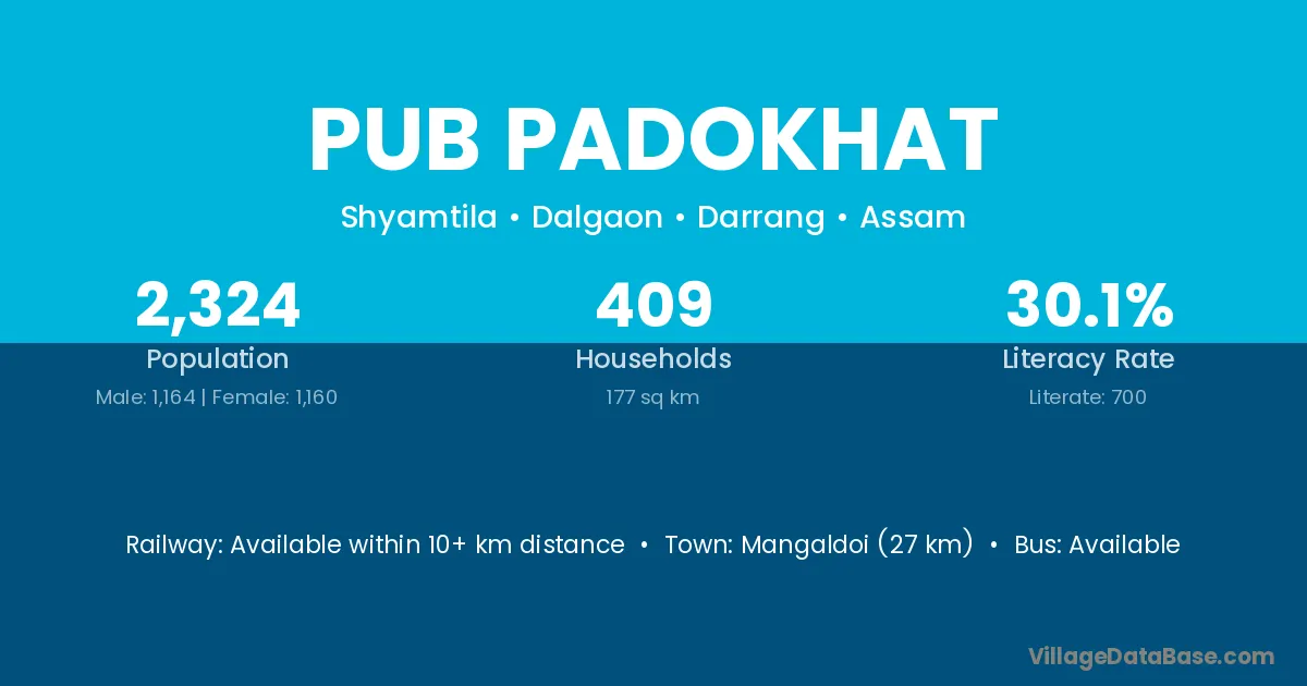 Mangaldoi (27 km) is the nearest town to Pub Padokhat village for major economic activities and is located approximately 27 km away.