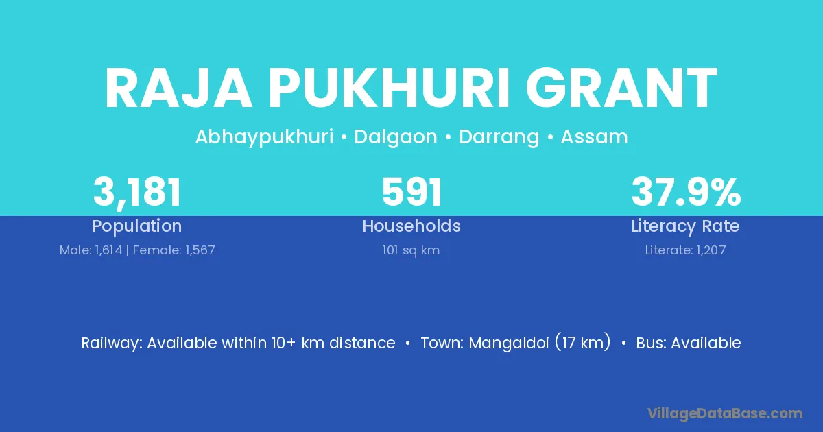 Mangaldoi (17 km) is the nearest town to Raja Pukhuri Grant village for major economic activities and is located approximately 17 km away.