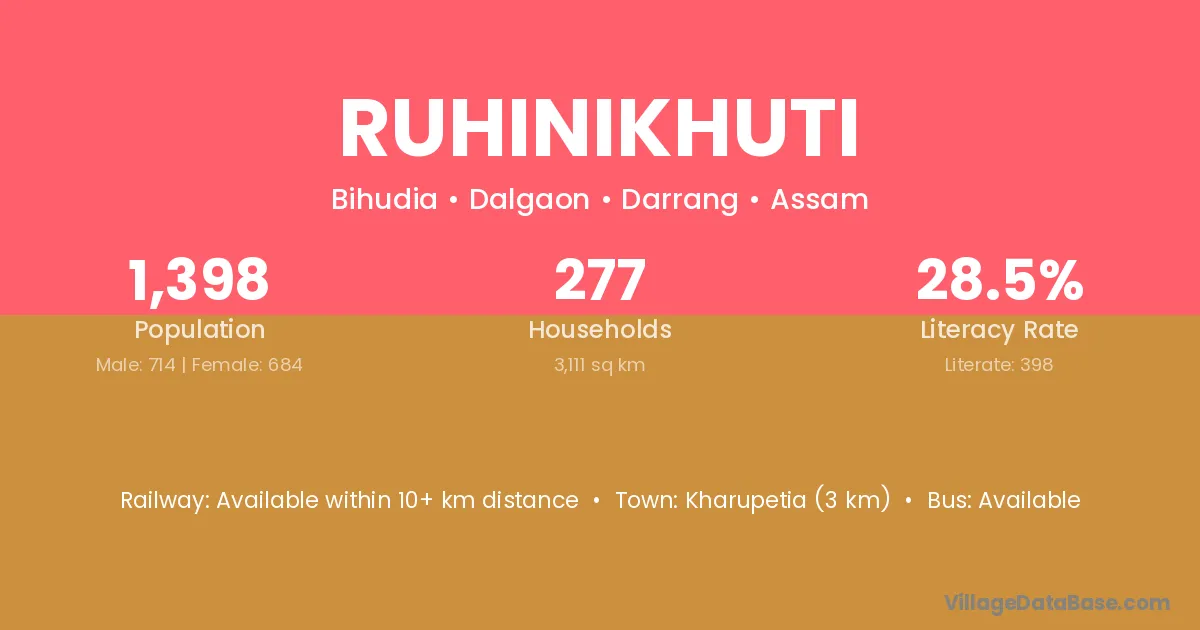 Kharupetia (3 km) is the nearest town to Ruhinikhuti village for major economic activities and is located approximately 3 km away.