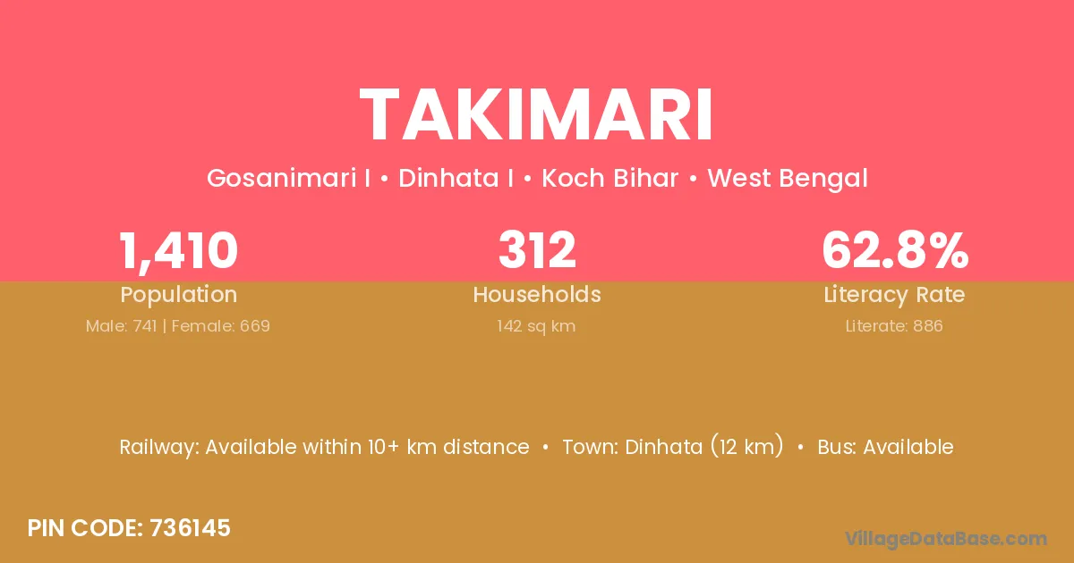 Kharupetia (15 km) is the nearest town to Takimari village for major economic activities and is located approximately 15 km away.
