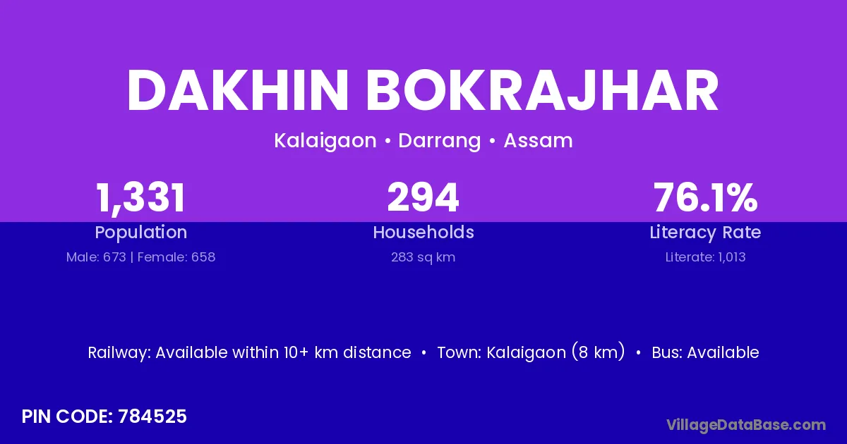 Kalaigaon (8 km) is the nearest town to Dakhin Bokrajhar village for major economic activities and is located approximately 8 km away.