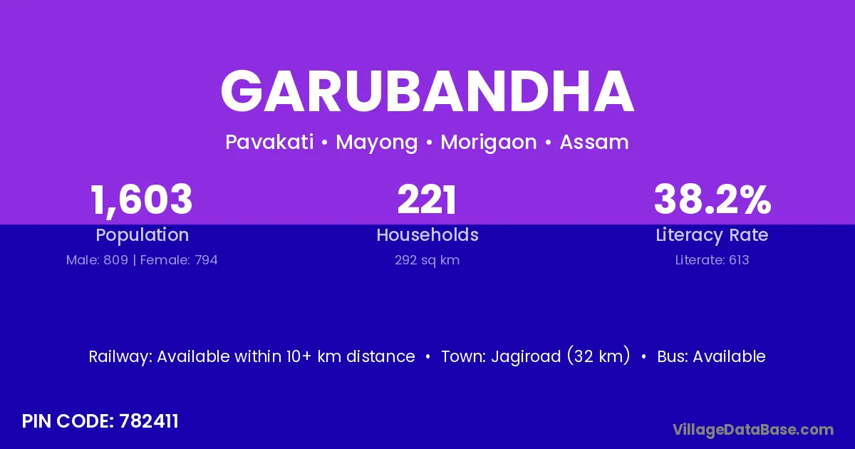 Kalaigaon (3 km) is the nearest town to Garubandha village for major economic activities and is located approximately 3 km away.