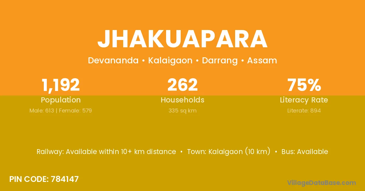 Kalaigaon (10 km) is the nearest town to Jhakuapara village for major economic activities and is located approximately 10 km away.