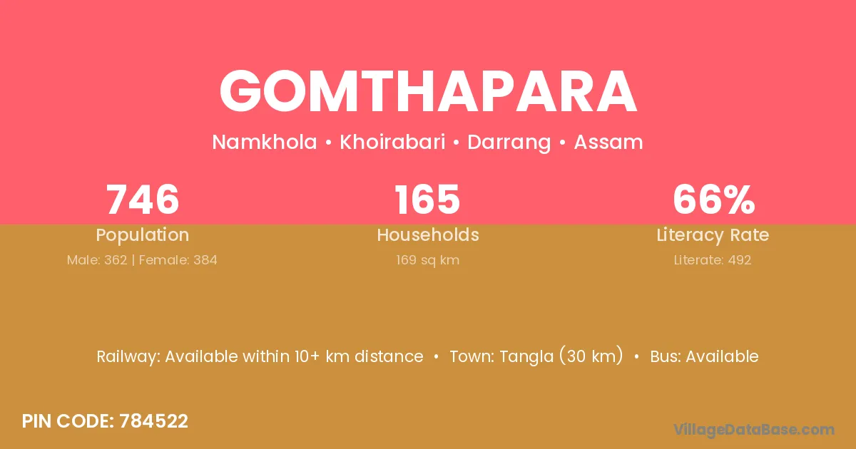 Gomthapara village has a total population of 746 people, of which 362 are males and 384 are females.
