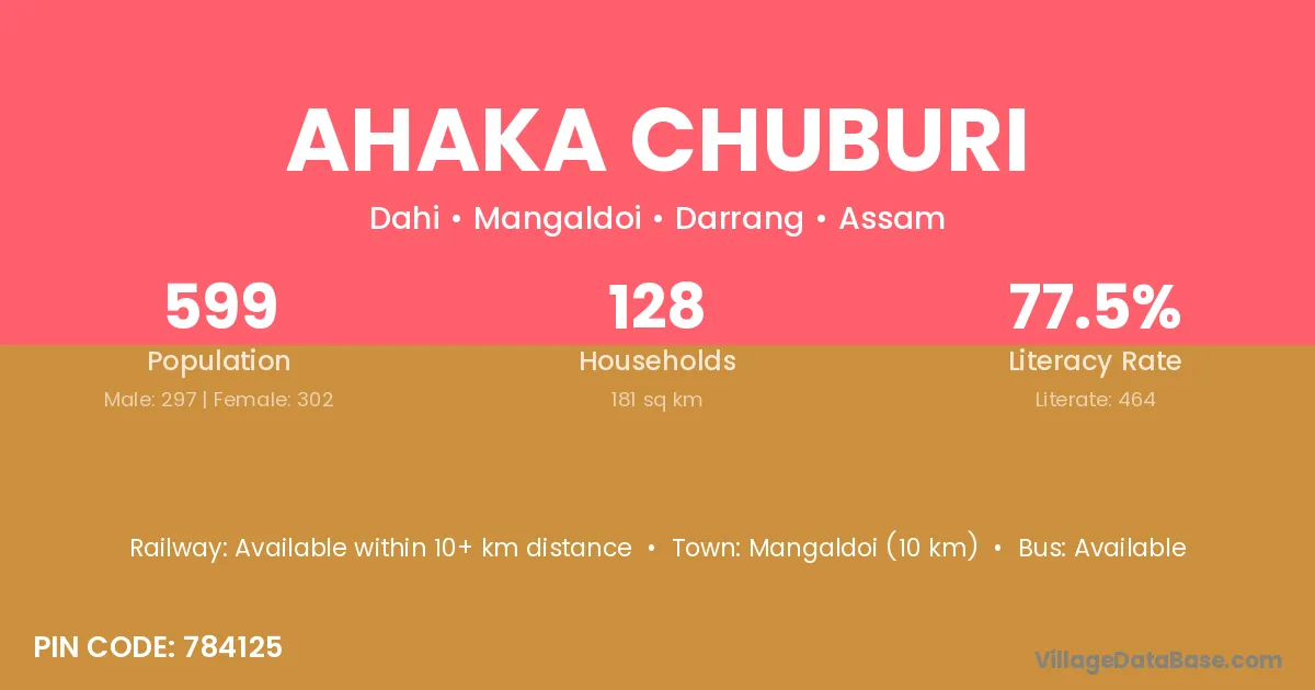 Mangaldoi (10 km) is the nearest town to Ahaka Chuburi village for major economic activities and is located approximately 10 km away.