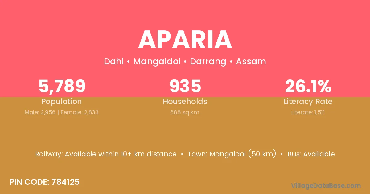 Mangaldoi (50 km) is the nearest town to Aparia village for major economic activities and is located approximately 50 km away.