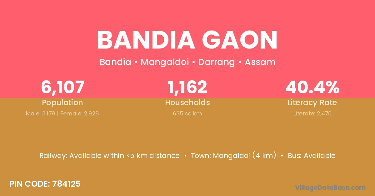 Mangaldoi (4 km) is the nearest town to Bandia Gaon village for major economic activities and is located approximately 4 km away.