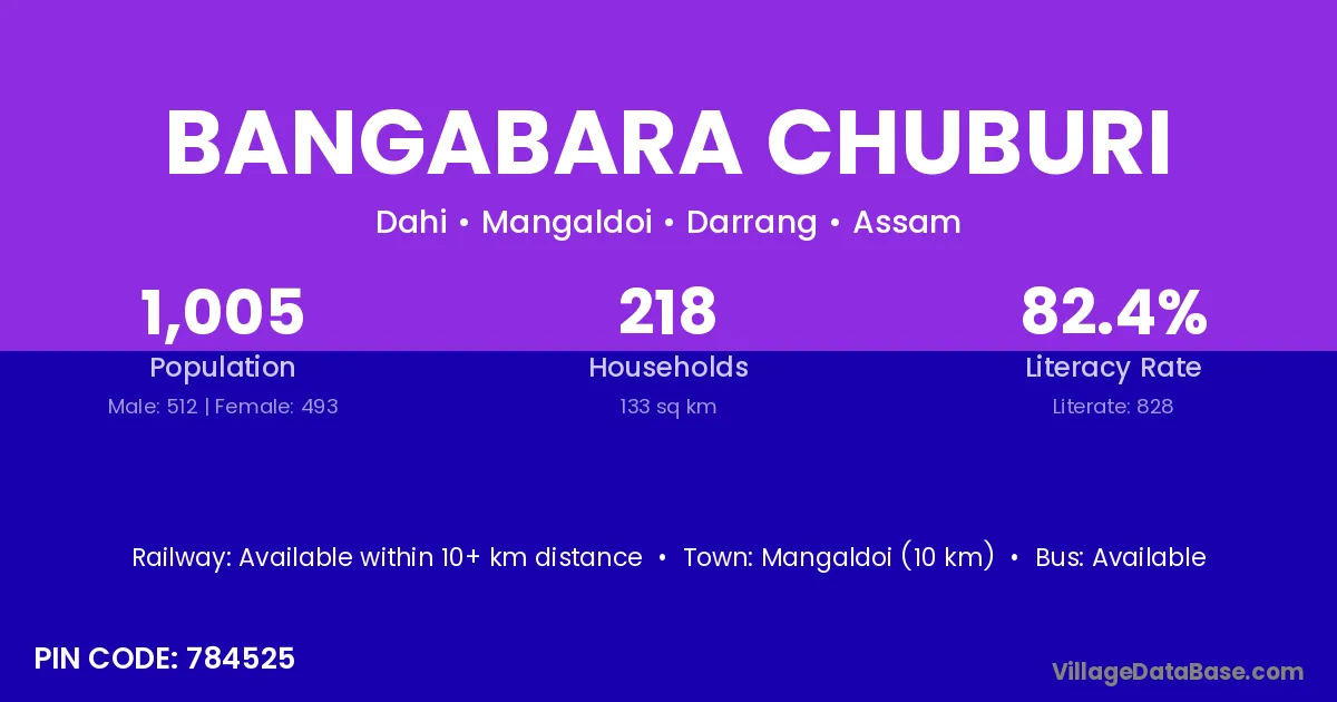 Mangaldoi (10 km) is the nearest town to Bangabara Chuburi village for major economic activities and is located approximately 10 km away.