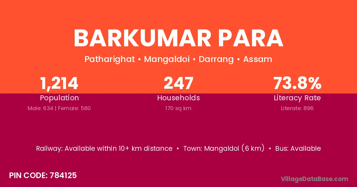 Mangaldoi (6 km) is the nearest town to Barkumar Para village for major economic activities and is located approximately 6 km away.