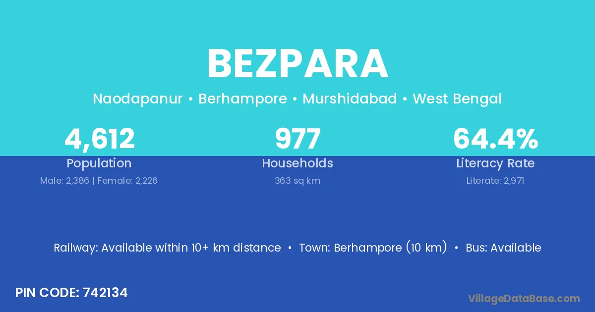 Bezpara village has a total population of 2,443 people, of which 1,220 are males and 1,223 are females.