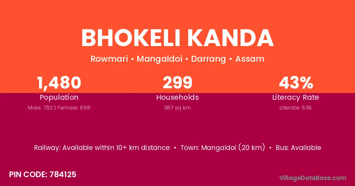 Mangaldoi (20 km) is the nearest town to Bhokeli Kanda village for major economic activities and is located approximately 20 km away.