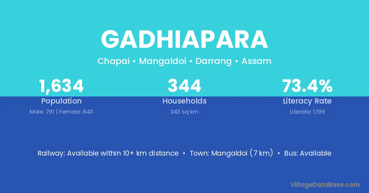 Mangaldoi (7 km) is the nearest town to Gadhiapara village for major economic activities and is located approximately 7 km away.
