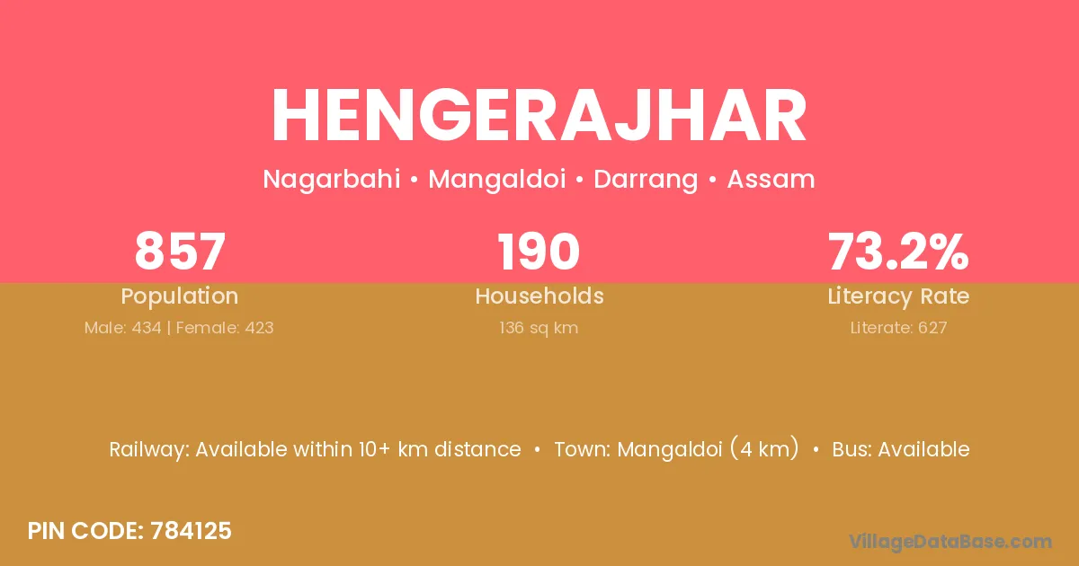 Mangaldoi (4 km) is the nearest town to Hengerajhar village for major economic activities and is located approximately 4 km away.